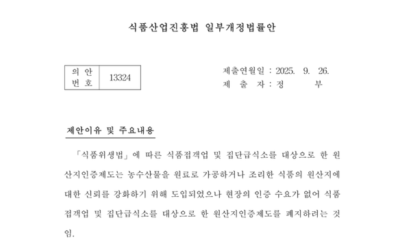 정부는 식품접객업소 및 집단급식소에서 시행 중이던 ‘원산지 인증제’를 폐지하기 위한 식품산업진흥법 일부개정안을 지난달 26일 입법 예고했습니다. 농식품부는 “현장 인증 수요가 거의 없다”는 점을 이유로 들었으며, 기존의 ‘원산지 표시제’는 그대로 유지한다고 설명했습니다.