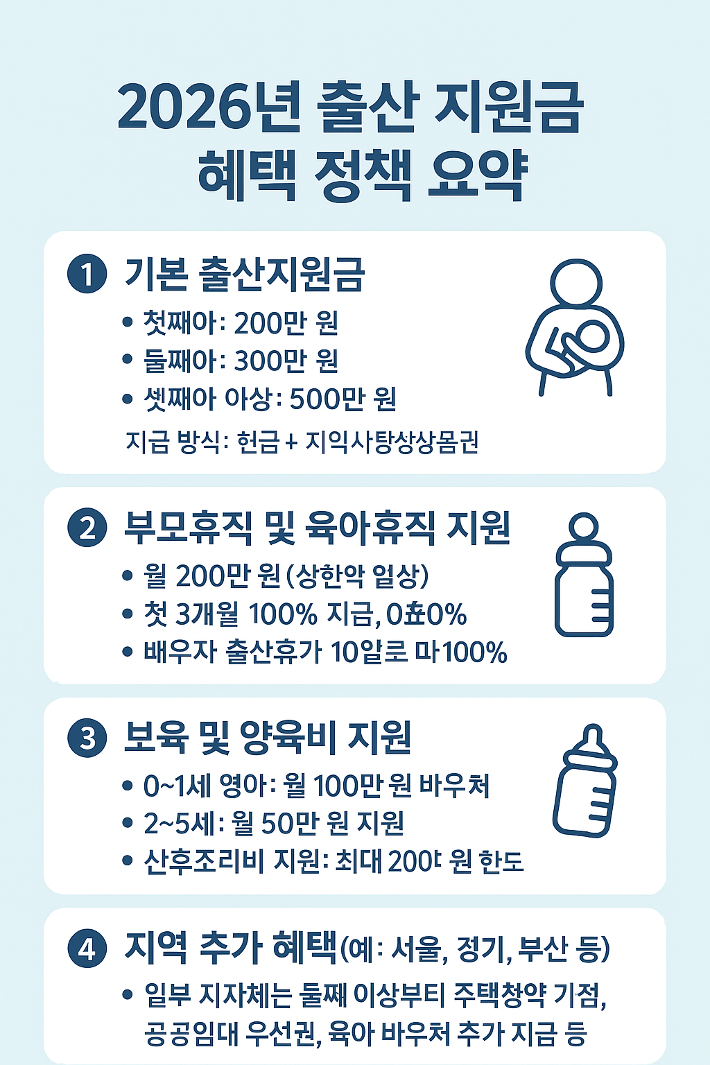 2026년 출산지원금 정책은 단순한 장려금이 아닌, 아이를 낳고 기르는 가정을 위한 종합 지원 체계입니다. 현금 지급 확대, 육아휴직 보강, 지역별 장려금이 결합되어 ‘진짜 체감형 복지’로 자리 잡을 전망입니다. 💪