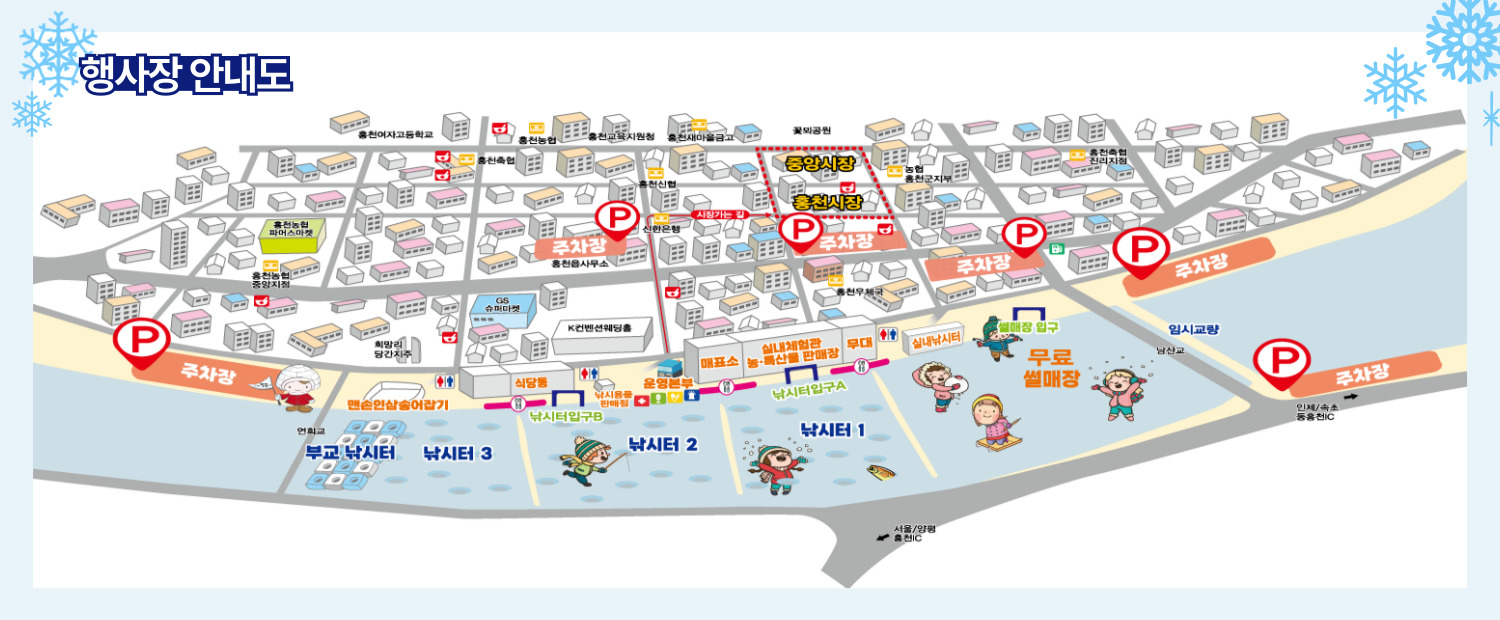 축제장 주차장은 오전 9시부터 오후 6시까지 운영되며 주차비는 무료입니다. 주차장에서 축제장까지는 도보 5분 거리이며, 겨울철 빙판길이므로 미끄럼 방지 신발 착용을 권장합니다.