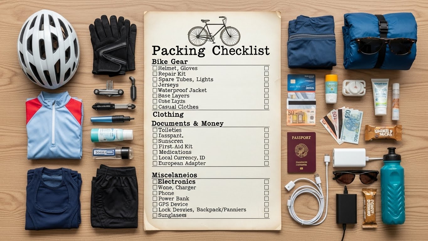 유럽 자전거 여행은 짐을 최소화하는 것이 성공의 열쇠입니다. 배낭 무게는 7kg 이내로 제한하고, 속건성 의류 3벌만 챙겨 매일 세탁하는 것을 추천합니다. 날씨 변화가 심한 알프스 지역은 방풍 재킷과 레인커버가 필수이며, 펑크 수리 키트와 휴대용 공기펌프는 꼭 준비하세요.