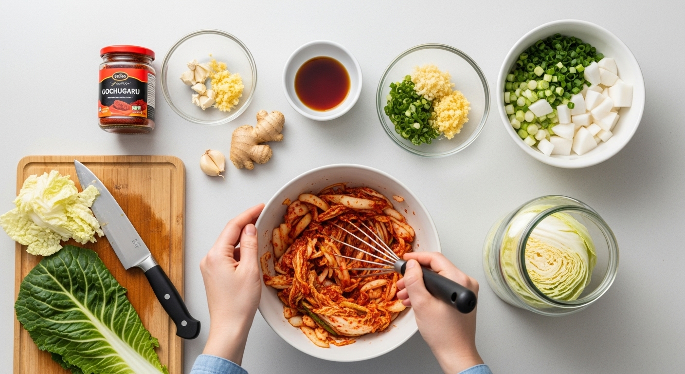 양념은 김치의 ‘영혼’입니다. 고춧가루의 매운맛, 젓갈의 감칠맛, 마늘과 생강의 향이 조화되어야 합니다.